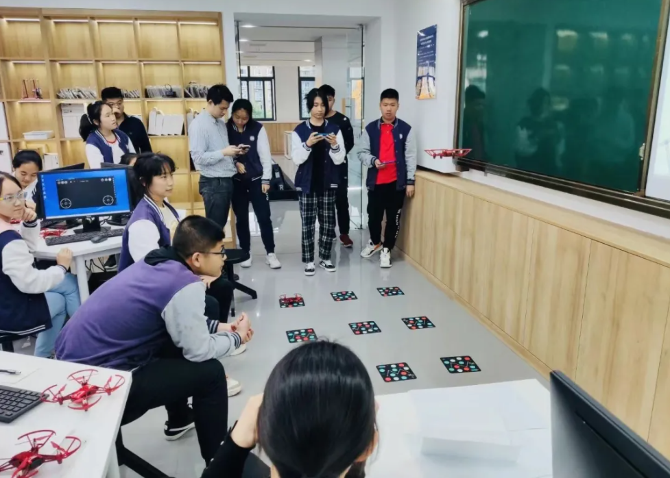 在金地教育5所與國(guó)科大合作科技中學(xué)項(xiàng)目中,創(chuàng)新多元的課程正在孩子們的身邊發(fā)生。上個(gè)月,國(guó)科大學(xué)重慶學(xué)院和重慶十一中合作共建的國(guó)科大中西部基礎(chǔ)科技教育創(chuàng)新中心內(nèi),56名初三學(xué)生就開展了一堂特別的編程課《你好!特洛創(chuàng)造力無人機(jī)》。